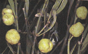 Citrus glauca is a medium shrub or small tree generally 3-7 metres in height bearing green to yellow coloured round fruit around the size of a marble. It is confined to inland areas, usually on heavy, clay soils. The foliage is greenish-grey, with oblong leaves up to 50mm long by 5 mm wide. The stems are spiny with irregularly spaced thorns. Flowers are 10 mm across, white or greenish in colour and appear in late winter and spring. The flowers are followed by greenish/yellow fruits which are globular in shape and about 15 mm diameter. The fruits are edible and have a strong citrus flavour which is widely sought by "bush tucker" enthusiasts.